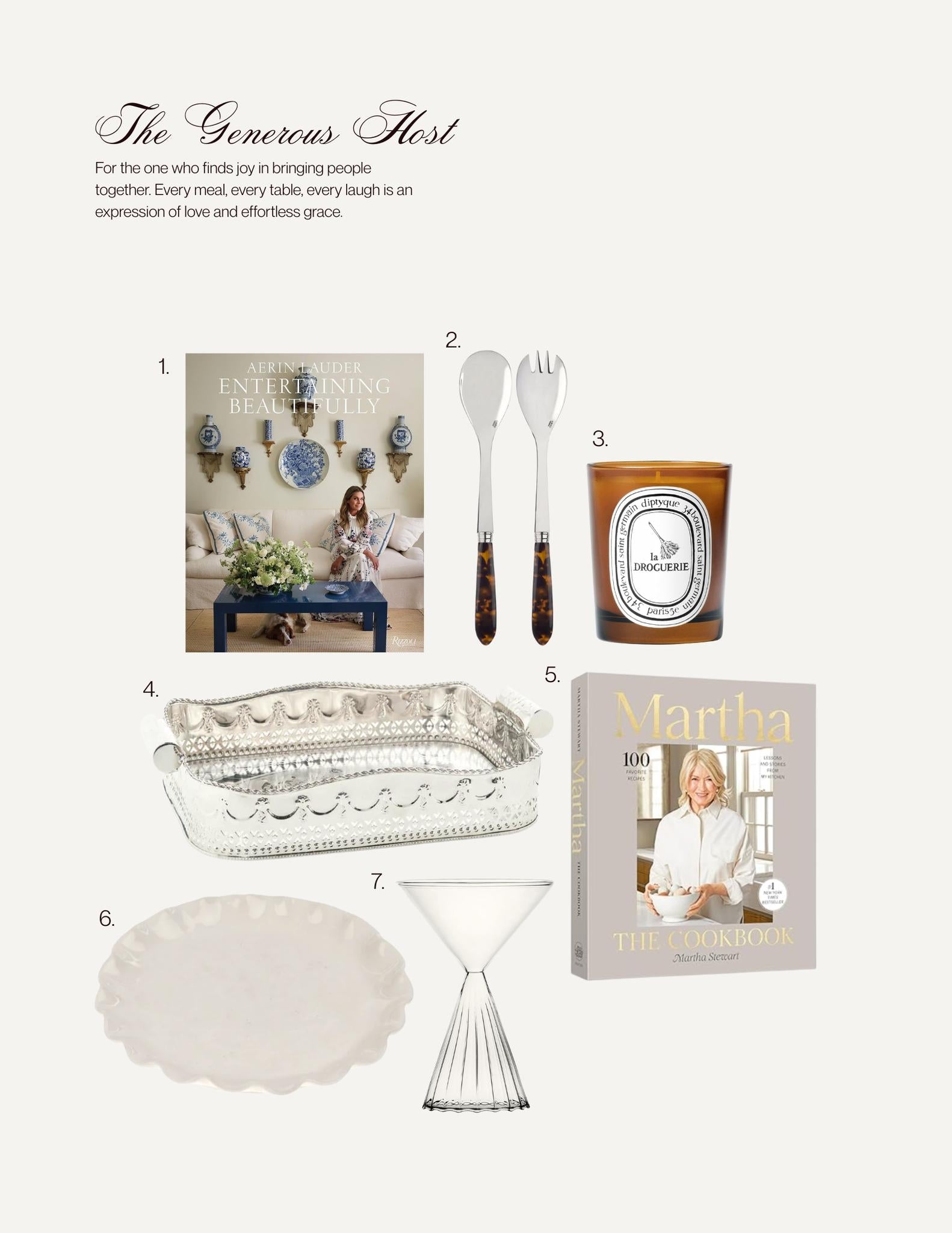 Aerin Lauder: Entertaining Beautifully| 2.Maison Salad Set| 3. Diptyque Odor Removing Candle (In Shoppe) | 4.Polished Nickel Abbey Tray| 5.Martha: The Cookbook| 6. Scalloped Plates (In shoppe) | 7.Tutu Glasses