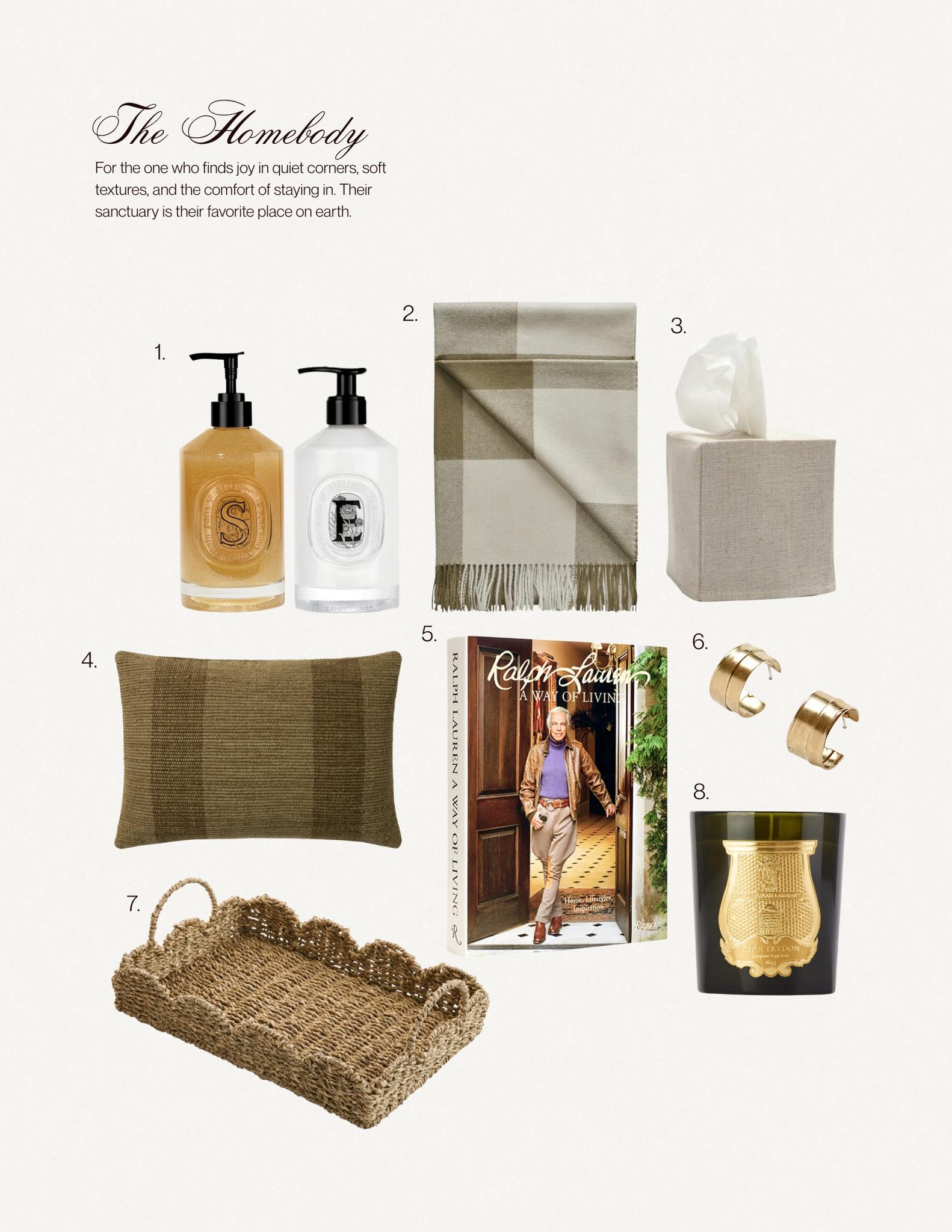 1. Diptyque Exfoliating Hand Wash & Velvet Lotion (In Shoppe) |2.Kenmore Alpaca/Lambswool Throw| 3.Savanna Oatmeal Linen Tissue Covers| 4.Leanne Ford x Loloi Mistwood Brown Pillow| 5.Ralph Lauren: A Way of Living| 6. Trudon Candle (In Shoppe) | 7.Scalloped Wicker Tray