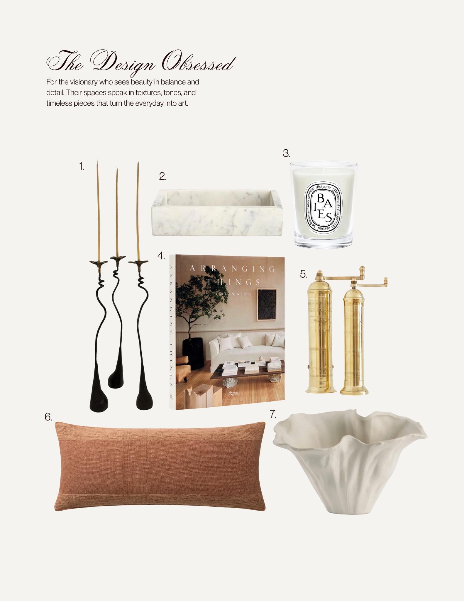 1.Meadow Iron Candlesticks| 2.Rosamonde Small Marble Tray| 3. Diptyque Candle (In Shoppe) | 4.Arranging Things by Colin King | 5.Brass Pepper & Salt Mill| 6.Leanne Ford x Loloi Medlock Rust Pillow| 7.Kit Ceramic Bowl
