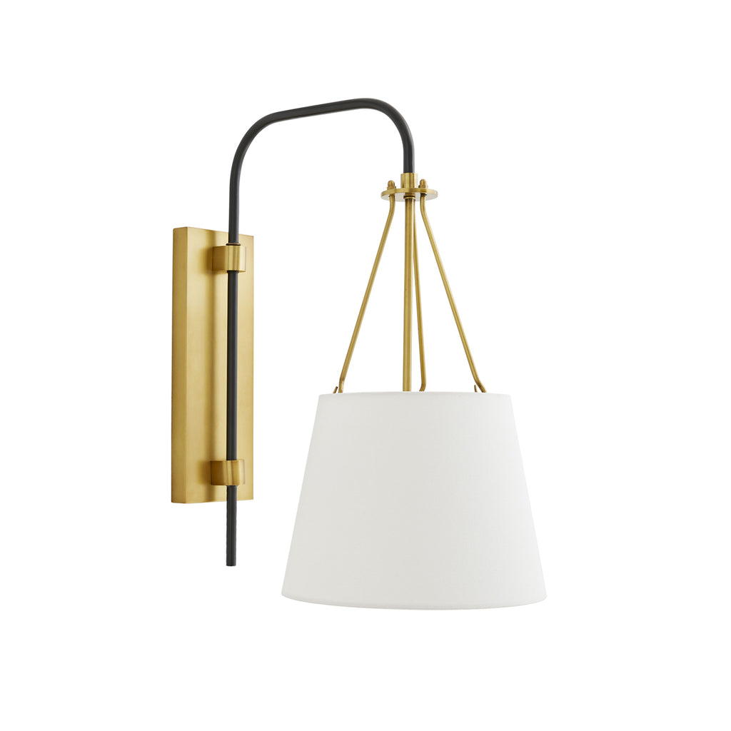 Classic style meets modern ingenuity with the Franklin. A steel chandelier-style hanging detail in an antique brass finish suspends a white linen shade delivering traditional elegance to a room. Extending from a bronze-finished plate is an archedarm that swings making this an ideal lighting design for a bedside or reading nook.